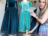 For our Aladdin Princess we have crafted Jasmine's two-piece signature outfit in a beautiful turquoise color with a lustrous gold trim. The top part of the outfit is made from our signature stretch velvet and boasts off-the-shoulder tulle sleeves that add a touch of elegance. The pants are also made from our signature stretch velvet and come with an elastic waistband that ensures a perfect fit. To complete the look, an added shimmering open-front tulle skirt with a gold trim. The skirt sits on top of the pants, creating a layered effect that gives the outfit one last magical touch.