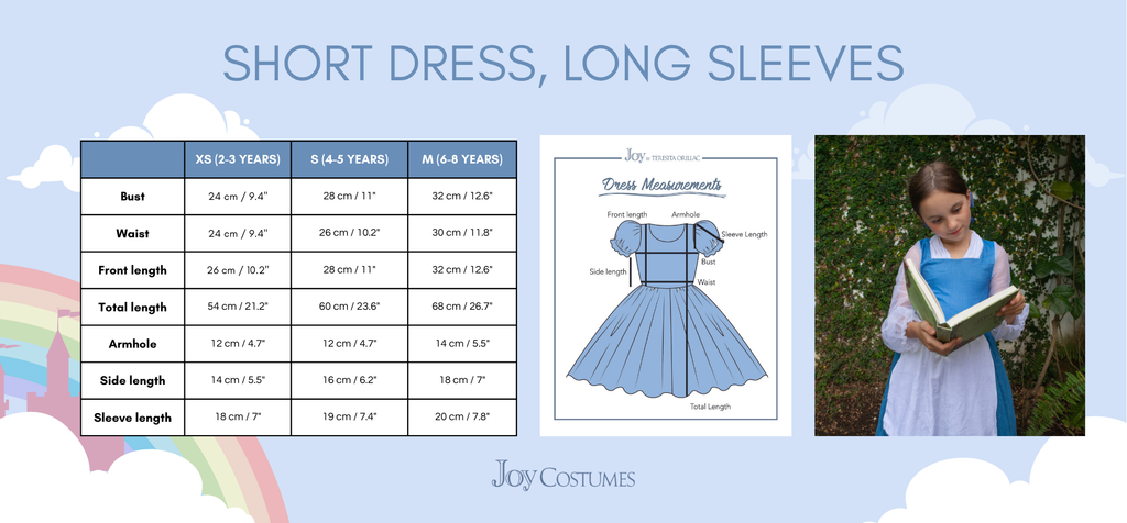 Let your little one step into the magical world of Beauty and the Beast with our Belle-inspired village dress. This delightful dress draws inspiration from Belle's charming blue outfit, seen in the beginning of the beloved story when she strolls through her village, engrossed in her favorite book.