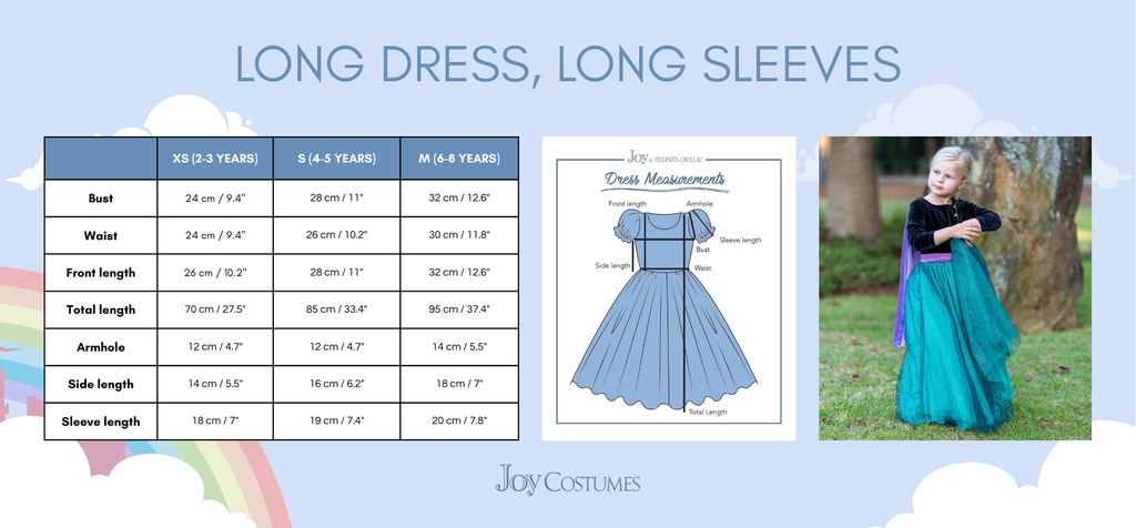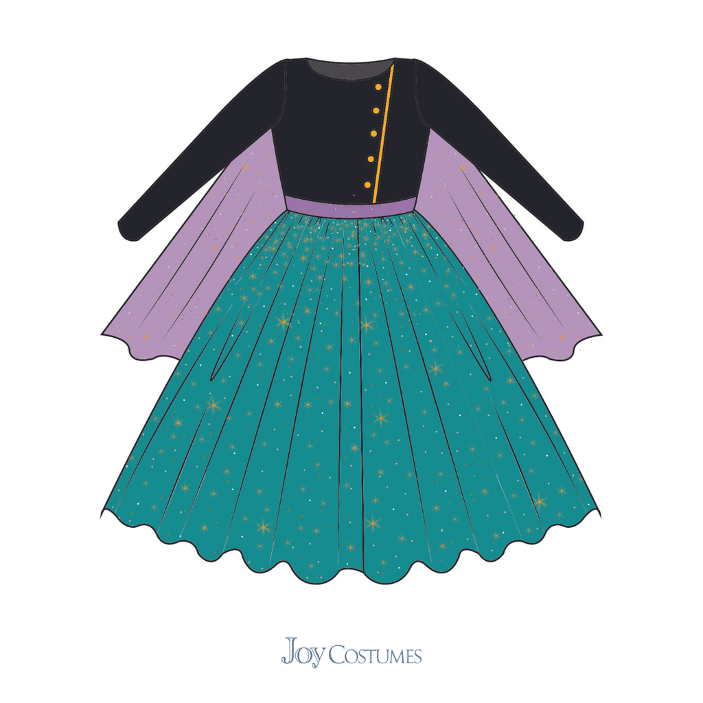 The design of this exquisite dress draws inspiration from the traditional Norwegian folk wear known as Bunad. It features a long-sleeved top made of our signature soft and stretchy velvet in black, adorned with gold decorative buttons. The waistband is a glittery purple, while the full tulle skirt is sparkling teal and lined with a cotton underskirt for maximum comfort. To add to its charm, the dress also includes a soft, purple tulle and a detachable velvet cape, because, of course, no royalty is complete without a cape.
